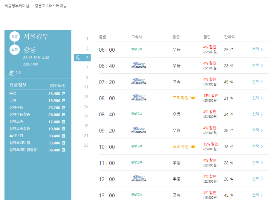 대신 강릉고속터미널에서 정동진까지 한번 더 이동이 필요합니다.