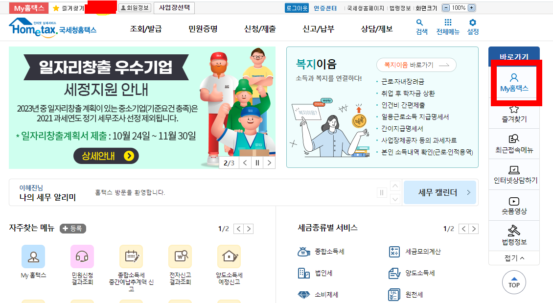 3. 우측에 "My홈택스" 클릭