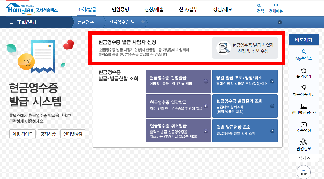 현금영수증 발급 사업자 신청을 클릭하시면 됩니다.