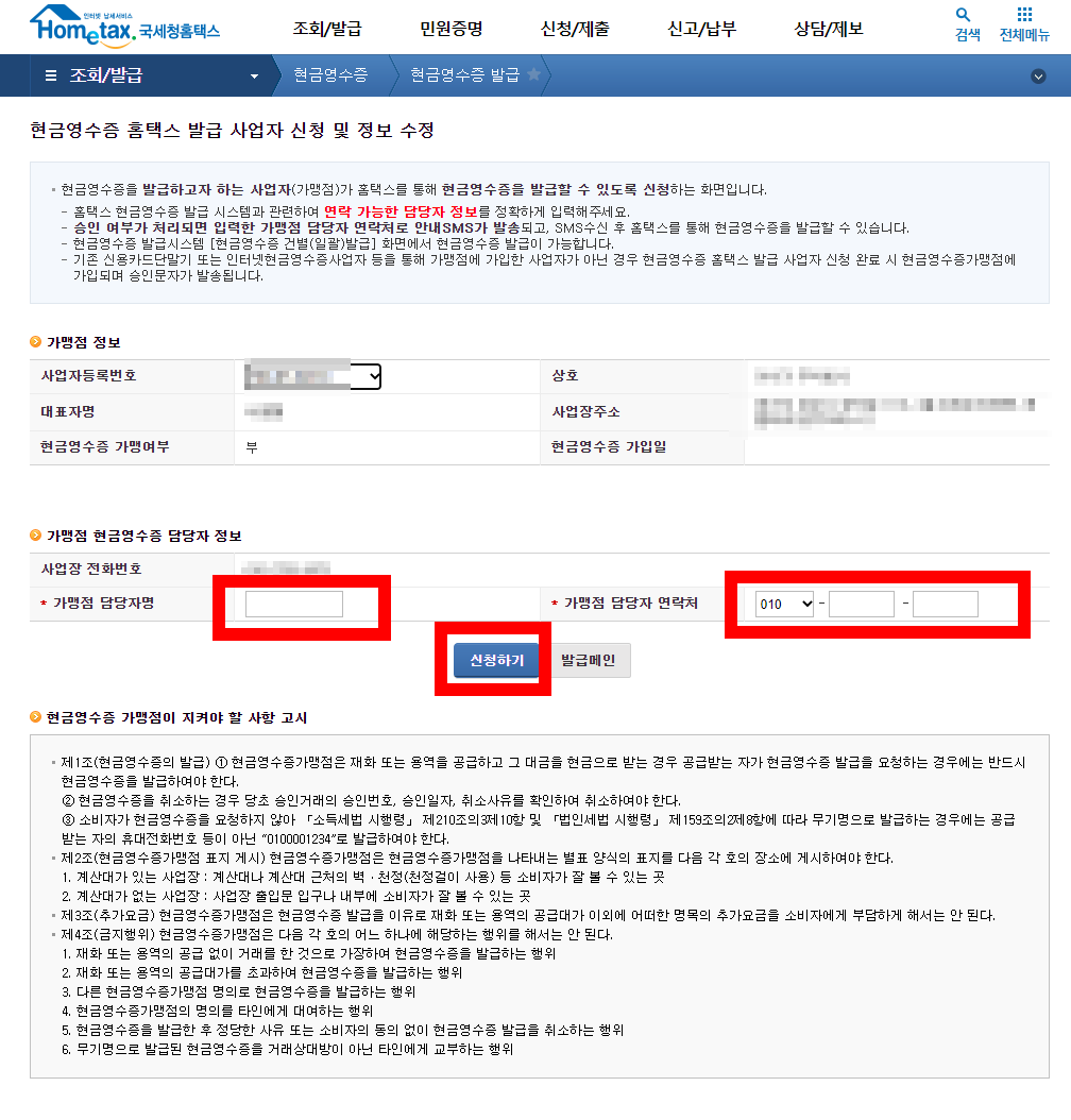 5. 상단의 "현금영수증 발급 사업자 신청" 클릭