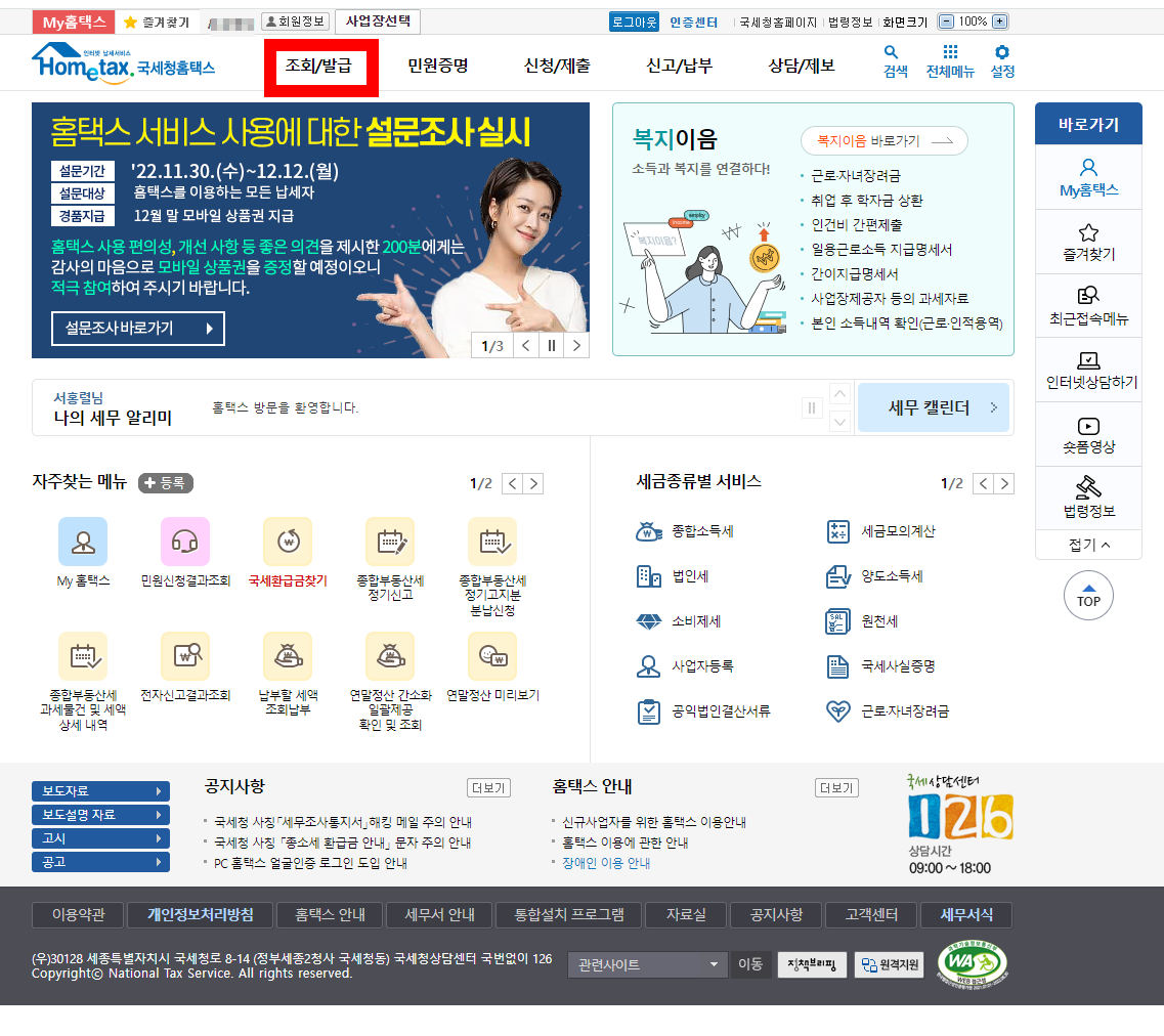 로그인 완료 후 상단(하단 사진 붉은상자)의 "조회/발급" 클릭하기